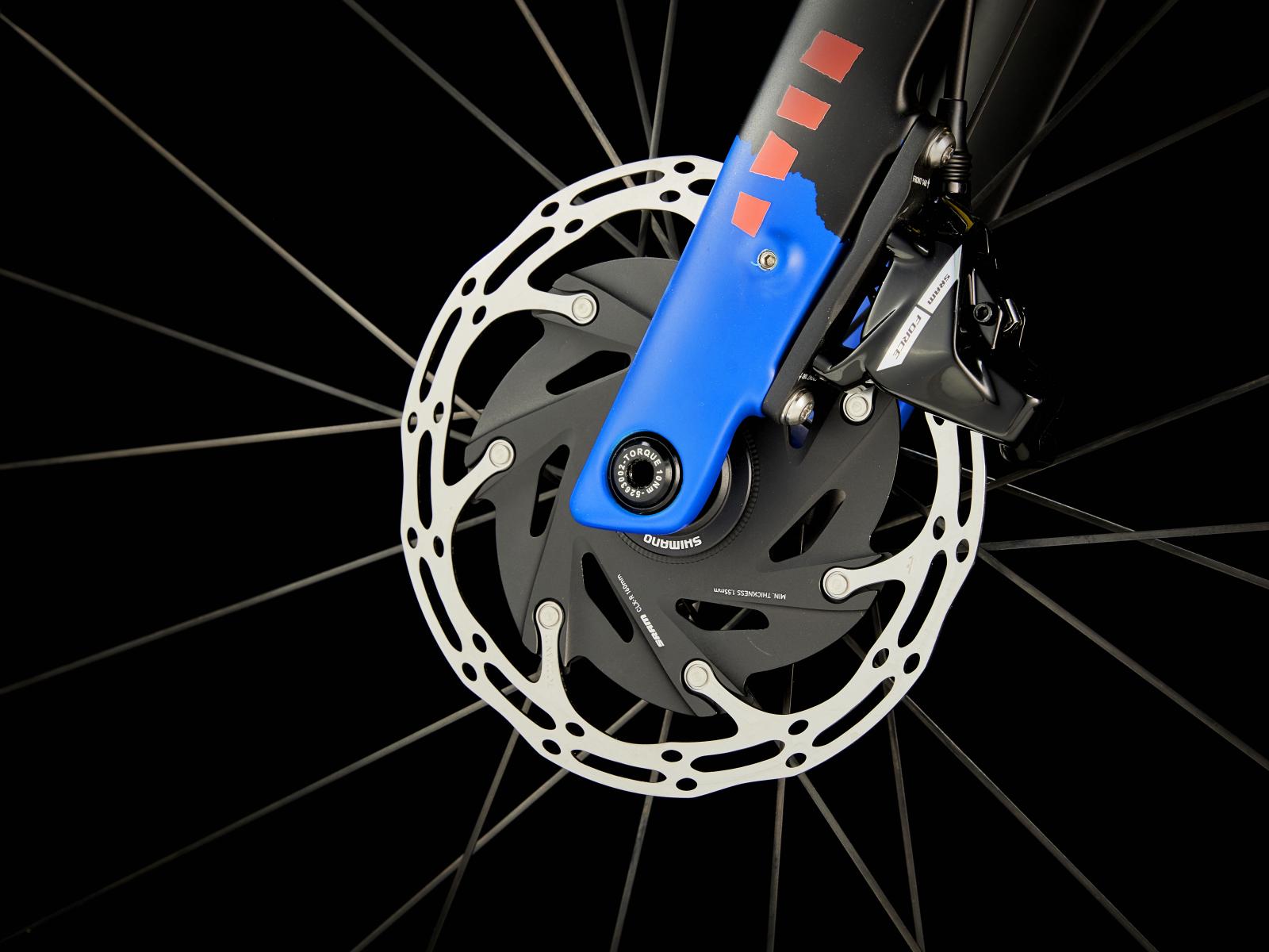 Gabel: Domane+ Carbon, konischer Carbongabelschaft, interne Bremszugführung, Schutzblechösen, Flat Mount Scheibenbremsaufnahme, 12x100 mm Steckachse