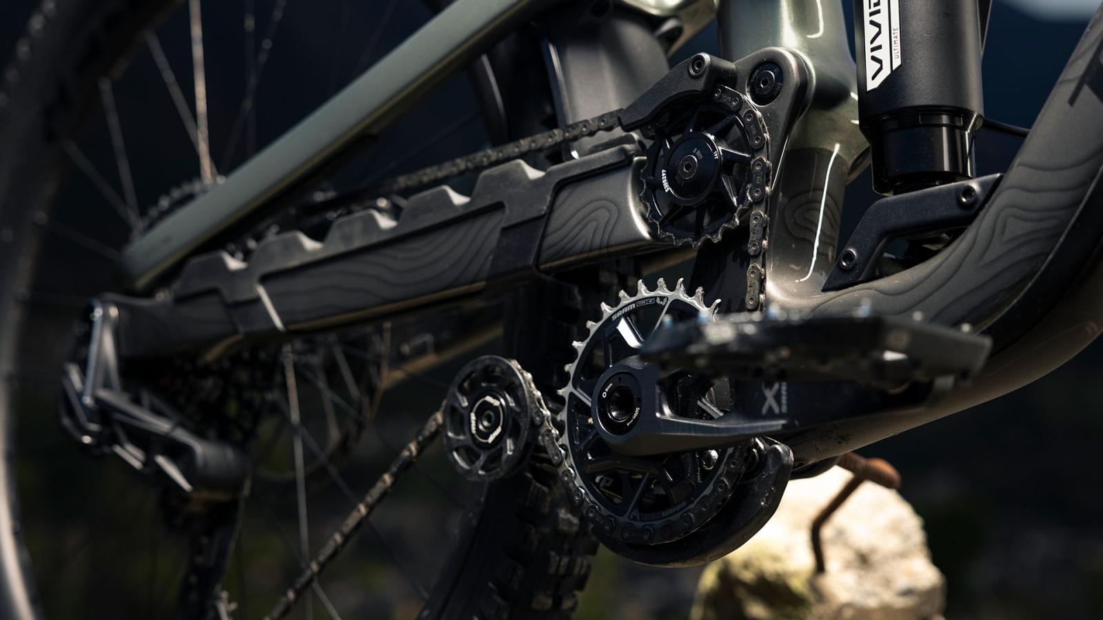 Die große obere Umlenkrolle am Slash beseitigt nicht nur den Pedalrückschlag des hohen Drehpunkts, sondern seine Größe und Positionierung garantiert zudem optimale Anti-Squat-Werte für eine hohe Antriebseffizienz. Die untere Umlenkrolle reduziert die Kettenspannung am Schaltwerk für geschmeidigere Gangwechsel und eine optimale Fahrwerks-Performance.