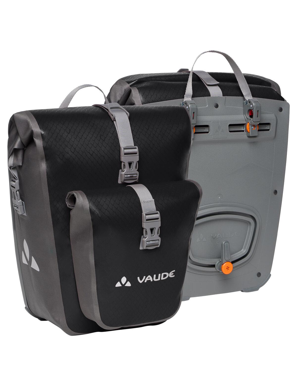pro Paar inkl. MwSt. zzgl. Versandkosten für StandardartikelAuf in die große, weite Welt! Die wasserdichten Hinterradtaschen werden aus robustem, PVC-freiem Planenmaterial am deutschen VAUDE-Standort in der Nähe des Bodensees hergestellt und würden gerne mit Dir auf große Reisen gehen. Sie lassen sich durch den Wickelverschluss auf individuelle Größen bringen und absolut dicht verschließen. Für Übersichtlichkeit sorgen eine einfache Innentasche sowie die aufgeschweißte Außentasche. Die Radtaschen werden mit dem QMR 2.0-System und stabiler Rückenplatte rechts und links am hinteren Gepäckträger befestigt, sind über einfach bedienbare Handrädchen justierbar und lassen sich schnell und einfach abnehmen. Mit einem Fahrradschloss können sie direkt am QMR-Haken verriegelt werden. Mit reflektierenden Elementen. Lieferumfang: zwei Taschen (Paar). Das Gesamtvolumen beider Taschen beträgt 51 Liter. Kann durch diese praktische Zubehör-Taschen ergänzt werden: Toolbag Back, Sortyour Back, Addita Bag.